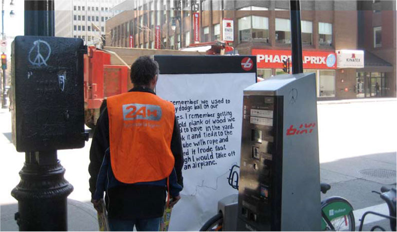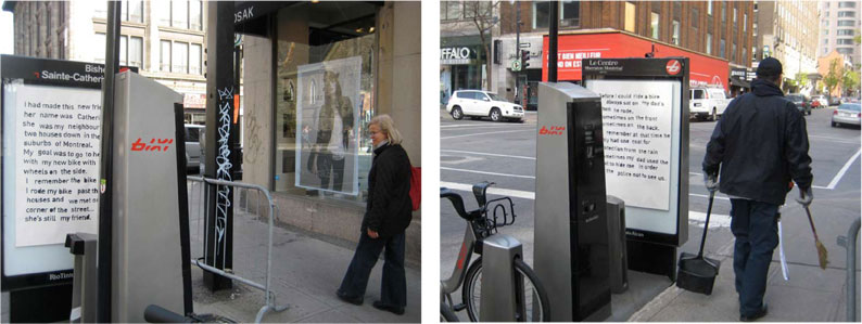 By the time I hit rue Ste-Catherine, it’s 3:00 am. I walk along the street, still noisy with traffic, and stop at the BIXI docking station on the corner of rue Guy. Swiftly, I peel the backing off of double-sided tape affixed to the reverse side of the poster and with an expansive sweep of my hand, I flatten it to the empty sign frame watching over the docking station. I step back and admire Josh’s cycle story in handmade lettering: